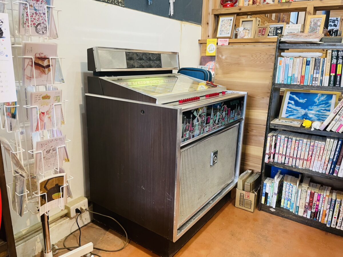 お店の奥の方にいくと、日本で3台くらいしかないと言われている、現役のとても大きなジュークボックスがあったり、座ってお茶が飲めるスペースがあったり、独特な雰囲気です。
